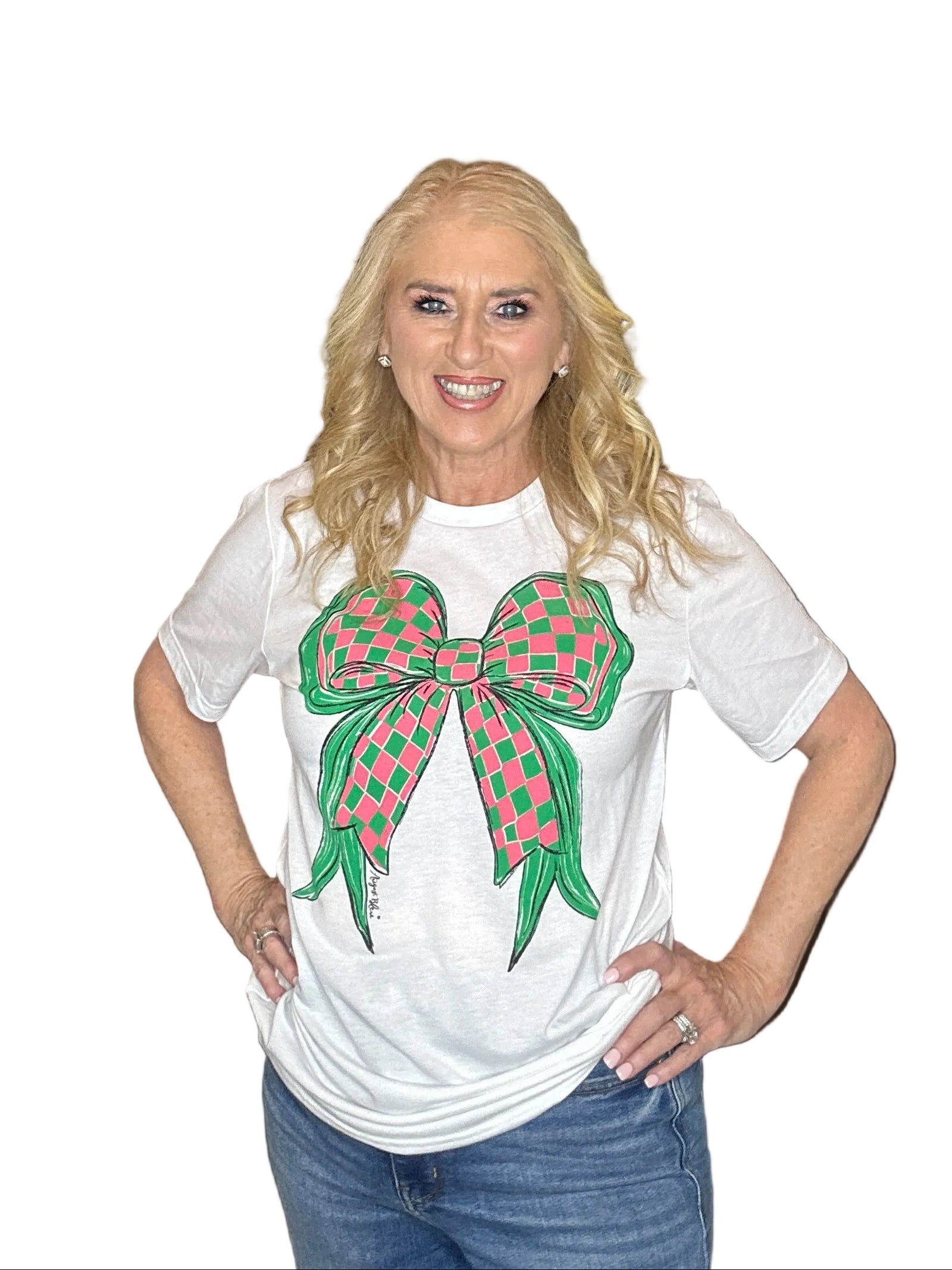 $ 44.00 USDCheckered Pink and Green Bow on White Tee