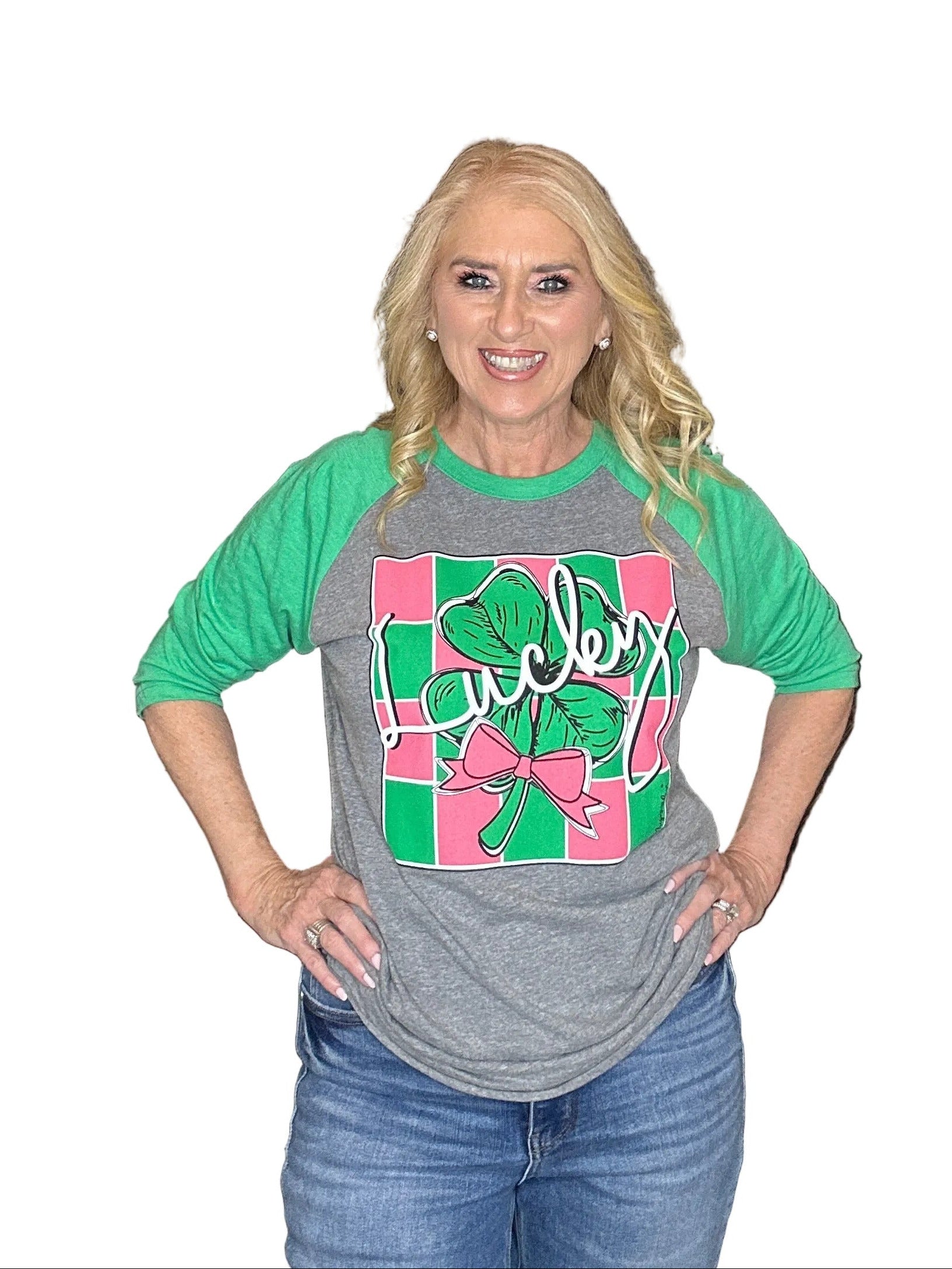 Luck might just be a shirt away! Slip into this charming green and pink checkered tee and let the good vibes flow. With its eye-catching contrast—vibrant green sleeves paired with a soft grey body—this baseball-style beauty practically glows. Whether you're celebrating St. Patrick's Day or just want to brighten your everyday rotation, this playful number delivers style that never fades. It's the kind of shirt that makes you smile the moment you put it on. This deign is on a tri-blend and it's oh so soft!
