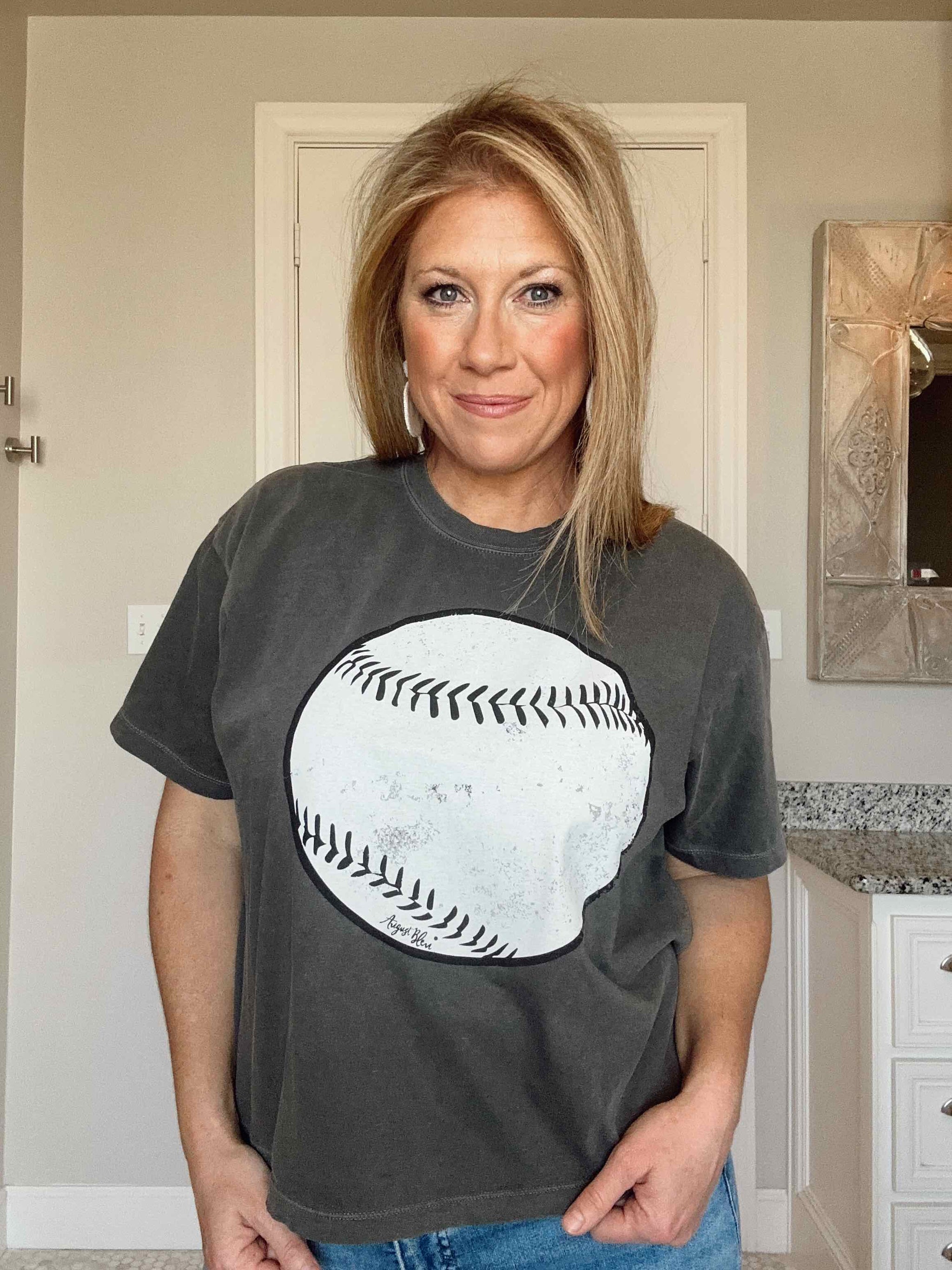 This supersized baseball design pops against this pepper comfort color cropped tee. It's perfect for spring and summer and can be worn with leggings, jeans or shorts. Garment-dyed for that lived in feel and almost no shrinkage at home.